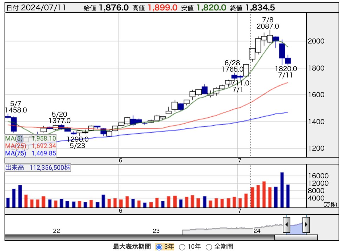 短期間にすごい角度で上がった株は、下がるのも急!